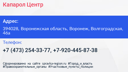 Капарол Центр по адресу 394028, Воронежская область, Воронеж, Волгоградская, 46а в дальнейшем Организация, размещена в следующих категориях:
