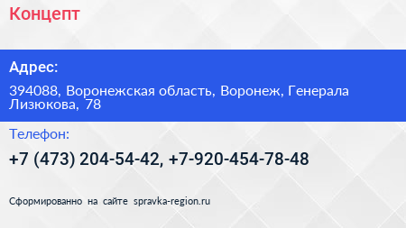 Концепт по адресу 394088, Воронежская область, Воронеж, Генерала Лизюкова, 78 в дальнейшем Организация, размещена в следующих категориях: