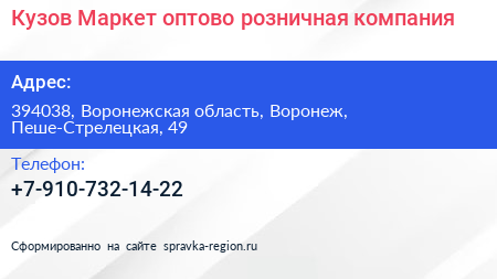 Кузов Маркет, оптово-розничная компания по адресу 394038, Воронежская область, Воронеж, Пеше-Стрелецкая, 49 в дальнейшем Организация, размещена в следующих категориях: