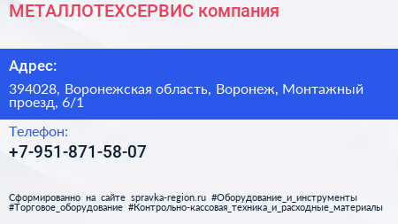МЕТАЛЛОТЕХСЕРВИС, компания по адресу 394028, Воронежская область, Воронеж, Монтажный проезд, 6/1 в дальнейшем Организация, размещена в следующих категориях: