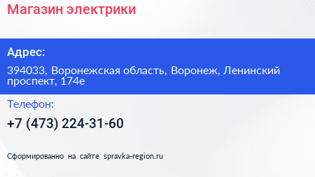 Магазин электрики по адресу 394033, Воронежская область, Воронеж, Ленинский проспект, 174е в дальнейшем Организация, размещена в следующих категориях: