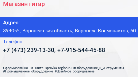 Магазин гитар по адресу 394055, Воронежская область, Воронеж, Космонавтов, 60 в дальнейшем Организация, размещена в следующих категориях: