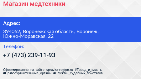 Магазин медтехники по адресу 394062, Воронежская область, Воронеж, Южно-Моравская, 22 в дальнейшем Организация, размещена в следующих категориях:
