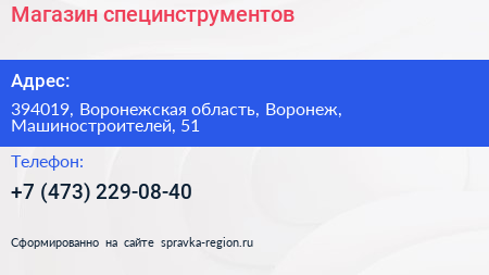 Магазин специнструментов по адресу 394019, Воронежская область, Воронеж, Машиностроителей, 51 в дальнейшем Организация, размещена в следующих категориях: