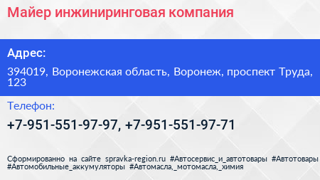 Майер, инжиниринговая компания по адресу 394019, Воронежская область, Воронеж, проспект Труда, 123 в дальнейшем Организация, размещена в следующих категориях: