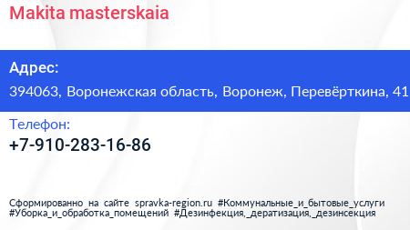 Makita masterskaia по адресу 394063, Воронежская область, Воронеж, Перевёрткина, 41 в дальнейшем Организация, размещена в следующих категориях: