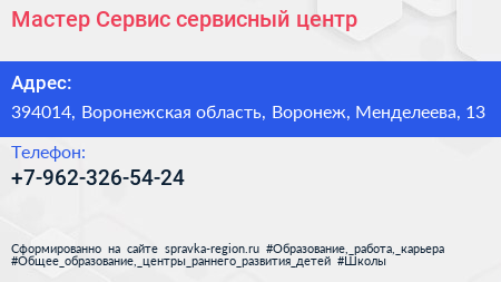 Мастер-Сервис, сервисный центр по адресу 394014, Воронежская область, Воронеж, Менделеева, 13 в дальнейшем Организация, размещена в следующих категориях: