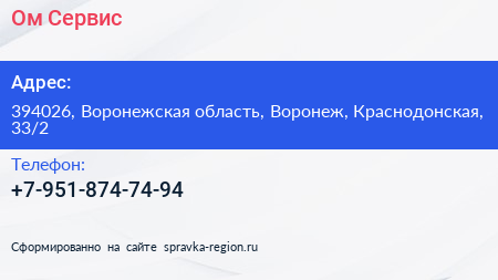 Ом-Сервис по адресу 394026, Воронежская область, Воронеж, Краснодонская, 33/2 в дальнейшем Организация, размещена в следующих категориях: