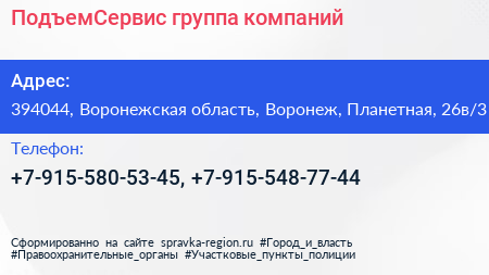ПодъемСервис, группа компаний по адресу 394044, Воронежская область, Воронеж, Планетная, 26в/3 в дальнейшем Организация, размещена в следующих категориях: