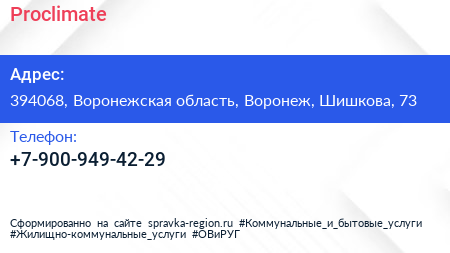 Proclimate по адресу 394068, Воронежская область, Воронеж, Шишкова, 73 в дальнейшем Организация, размещена в следующих категориях: