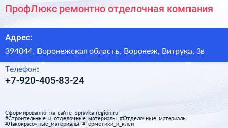 ПрофЛюкс, ремонтно-отделочная компания по адресу 394044, Воронежская область, Воронеж, Витрука, 3в в дальнейшем Организация, размещена в следующих категориях: