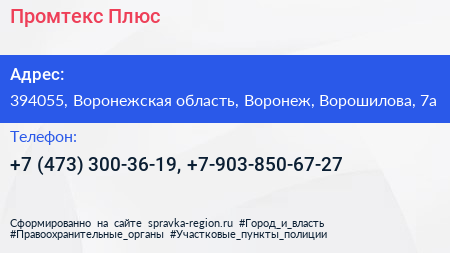 Промтекс Плюс по адресу 394055, Воронежская область, Воронеж, Ворошилова, 7а в дальнейшем Организация, размещена в следующих категориях: