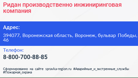 Ридан, производственно-инжиниринговая компания по адресу 394077, Воронежская область, Воронеж, бульвар Победы, 46 в дальнейшем Организация, размещена в следующих категориях: