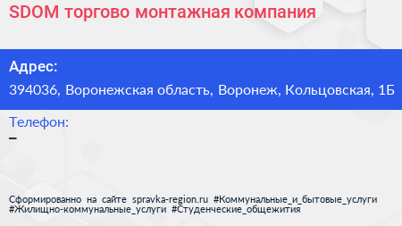 SDOM, торгово-монтажная компания по адресу 394036, Воронежская область, Воронеж, Кольцовская, 1Б в дальнейшем Организация, размещена в следующих категориях:
