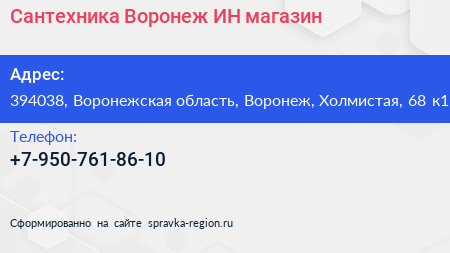 Сантехника Воронеж ИН, магазин по адресу 394038, Воронежская область, Воронеж, Холмистая, 68 к1 в дальнейшем Организация, размещена в следующих категориях: