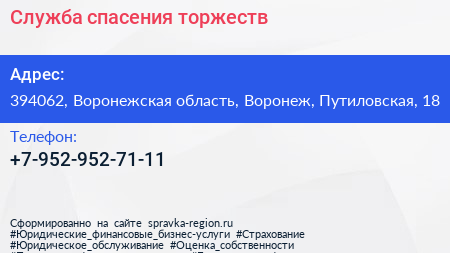 Служба спасения торжеств по адресу 394062, Воронежская область, Воронеж, Путиловская, 18 в дальнейшем Организация, размещена в следующих категориях: