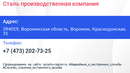 Сталь, производственная компания по адресу 394019, Воронежская область, Воронеж, Краснодонская, 31 в дальнейшем Организация, размещена в следующих категориях: