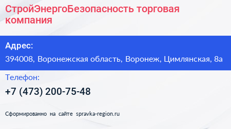 СтройЭнергоБезопасность, торговая компания по адресу 394008, Воронежская область, Воронеж, Цимлянская, 8а в дальнейшем Организация, размещена в следующих категориях: