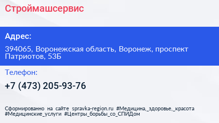 Строймашсервис по адресу 394065, Воронежская область, Воронеж, проспект Патриотов, 53Б в дальнейшем Организация, размещена в следующих категориях: