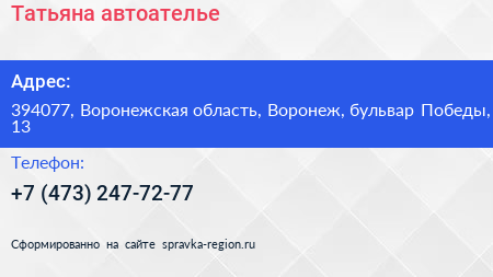 Татьяна, автоателье по адресу 394077, Воронежская область, Воронеж, бульвар Победы, 13 в дальнейшем Организация, размещена в следующих категориях: