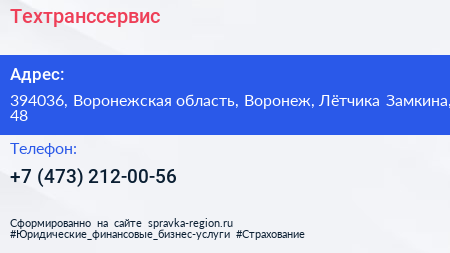 Техтранссервис по адресу 394036, Воронежская область, Воронеж, Лётчика Замкина, 48 в дальнейшем Организация, размещена в следующих категориях: