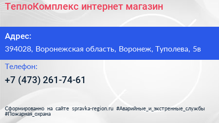 ТеплоКомплекс, интернет-магазин по адресу 394028, Воронежская область, Воронеж, Туполева, 5в в дальнейшем Организация, размещена в следующих категориях:
