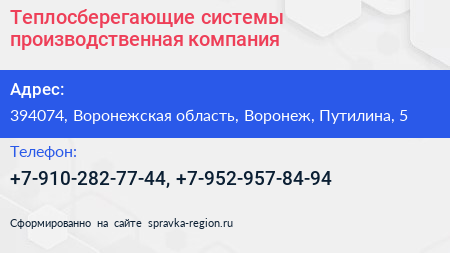 Теплосберегающие системы, производственная компания по адресу 394074, Воронежская область, Воронеж, Путилина, 5 в дальнейшем Организация, размещена в следующих категориях: