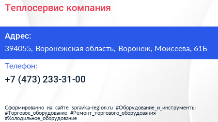 Теплосервис, компания по адресу 394055, Воронежская область, Воронеж, Моисеева, 61Б в дальнейшем Организация, размещена в следующих категориях: