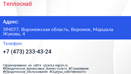 Теплоснаб по адресу 394077, Воронежская область, Воронеж, Маршала Жукова, 4 в дальнейшем Организация, размещена в следующих категориях: