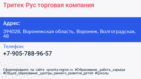Тритек Рус, торговая компания по адресу 394028, Воронежская область, Воронеж, Волгоградская, 48 в дальнейшем Организация, размещена в следующих категориях: