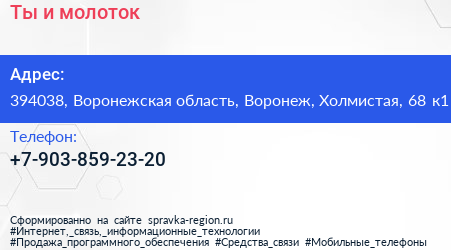 Ты и молоток по адресу 394038, Воронежская область, Воронеж, Холмистая, 68 к1 в дальнейшем Организация, размещена в следующих категориях: