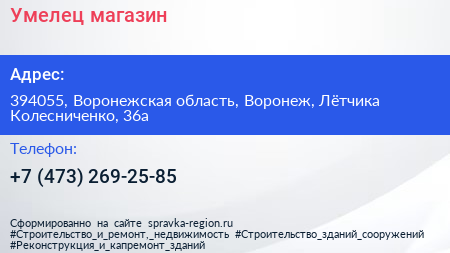 Умелец, магазин по адресу 394055, Воронежская область, Воронеж, Лётчика Колесниченко, 36а в дальнейшем Организация, размещена в следующих категориях: