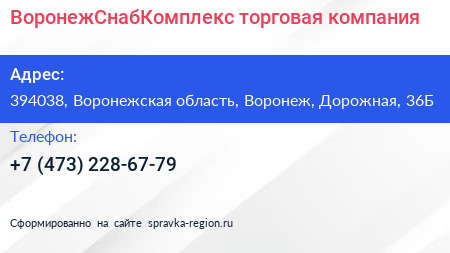 ВоронежСнабКомплекс, торговая компания по адресу 394038, Воронежская область, Воронеж, Дорожная, 36Б в дальнейшем Организация, размещена в следующих категориях: