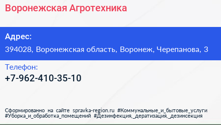 Воронежская Агротехника по адресу 394028, Воронежская область, Воронеж, Черепанова, 3 в дальнейшем Организация, размещена в следующих категориях: