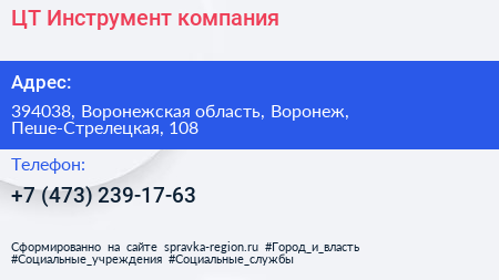 ЦТ Инструмент, компания по адресу 394038, Воронежская область, Воронеж, Пеше-Стрелецкая, 108 в дальнейшем Организация, размещена в следующих категориях: