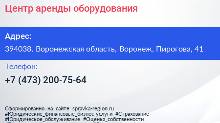 Центр аренды оборудования по адресу 394038, Воронежская область, Воронеж, Пирогова, 41 в дальнейшем Организация, размещена в следующих категориях:
