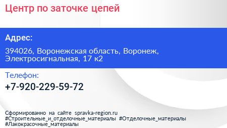 Центр по заточке цепей по адресу 394026, Воронежская область, Воронеж, Электросигнальная, 17 к2 в дальнейшем Организация, размещена в следующих категориях:
