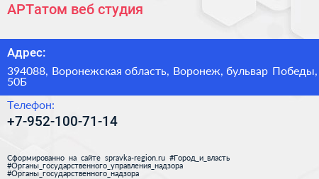 АРТатом, веб-студия по адресу 394088, Воронежская область, Воронеж, бульвар Победы, 50Б в дальнейшем Организация, размещена в следующих категориях: