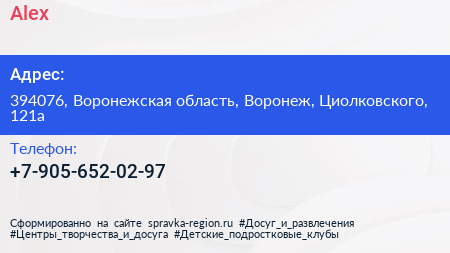 Alex+ по адресу 394076, Воронежская область, Воронеж, Циолковского, 121а в дальнейшем Организация, размещена в следующих категориях: