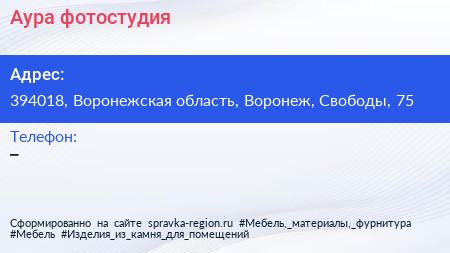 Аура, фотостудия по адресу 394018, Воронежская область, Воронеж, Свободы, 75 в дальнейшем Организация, размещена в следующих категориях: