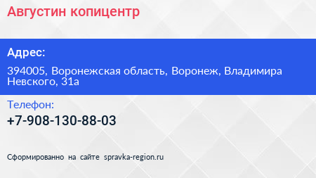 Августин, копицентр по адресу 394005, Воронежская область, Воронеж, Владимира Невского, 31а в дальнейшем Организация, размещена в следующих категориях: