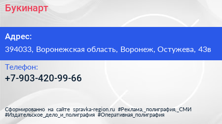 Букинарт по адресу 394033, Воронежская область, Воронеж, Остужева, 43в в дальнейшем Организация, размещена в следующих категориях:
