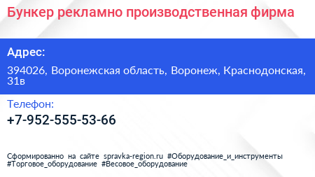 Бункер, рекламно-производственная фирма по адресу 394026, Воронежская область, Воронеж, Краснодонская, 31в в дальнейшем Организация, размещена в следующих категориях:
