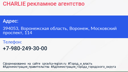 CHARLIE, рекламное агентство по адресу 394053, Воронежская область, Воронеж, Московский проспект, 114 в дальнейшем Организация, размещена в следующих категориях: