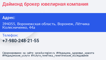 Даймонд брокер, ювелирная компания по адресу 394055, Воронежская область, Воронеж, Лётчика Колесниченко, 44а в дальнейшем Организация, размещена в следующих категориях: