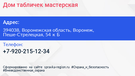 Дом табличек, мастерская по адресу 394038, Воронежская область, Воронеж, Пеше-Стрелецкая, 54 к Б в дальнейшем Организация, размещена в следующих категориях: