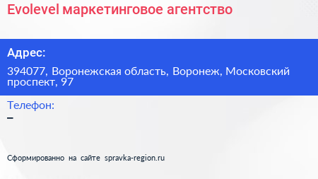Evolevel, маркетинговое агентство по адресу 394077, Воронежская область, Воронеж, Московский проспект, 97 в дальнейшем Организация, размещена в следующих категориях: