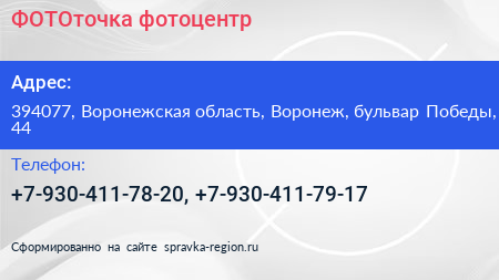 ФОТОточка, фотоцентр по адресу 394077, Воронежская область, Воронеж, бульвар Победы, 44 в дальнейшем Организация, размещена в следующих категориях: