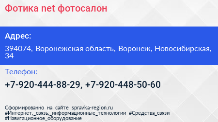 Фотика.net, фотосалон по адресу 394074, Воронежская область, Воронеж, Новосибирская, 34 в дальнейшем Организация, размещена в следующих категориях: