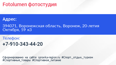 Fotolumen, фотостудия по адресу 394071, Воронежская область, Воронеж, 20-летия Октября, 59 к3 в дальнейшем Организация, размещена в следующих категориях: